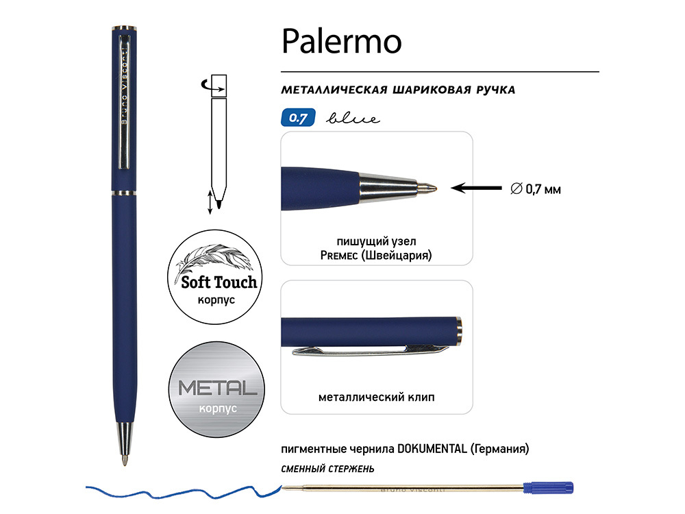 Ручка шариковая автоматическая BrunoVisconti® "PALERMO" цвет корпуса темно-синий, soft-touch, 0.7 мм в ассортименте цветов, материалов и моделей