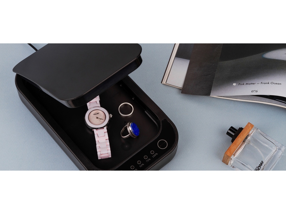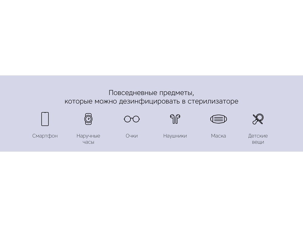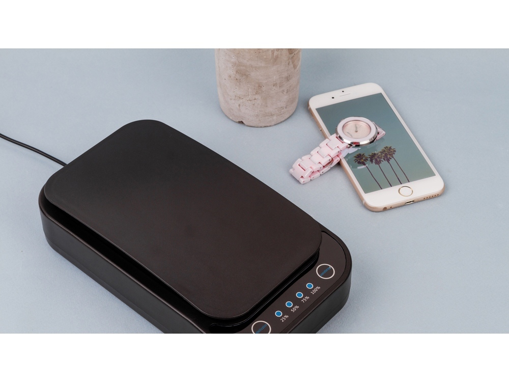Портативный стерилизатор с беспроводной зарядкой Rombica Sterilizer Portable. — эффективность стерилизации 99,9%, — борьба с вирусами и бактериями, — стерилизация поверхности устройств на 360°, — беспроводное зарядное устройство, — функция ароматизации, — автоматическая работа. Сенсорное управление. Размер внутренней поверхности: 180 x 100 x 22 мм (7" телефоны). Мощность стерилизации: 2 x 1 Вт. Мощность ароматизации: 1 Вт.