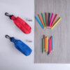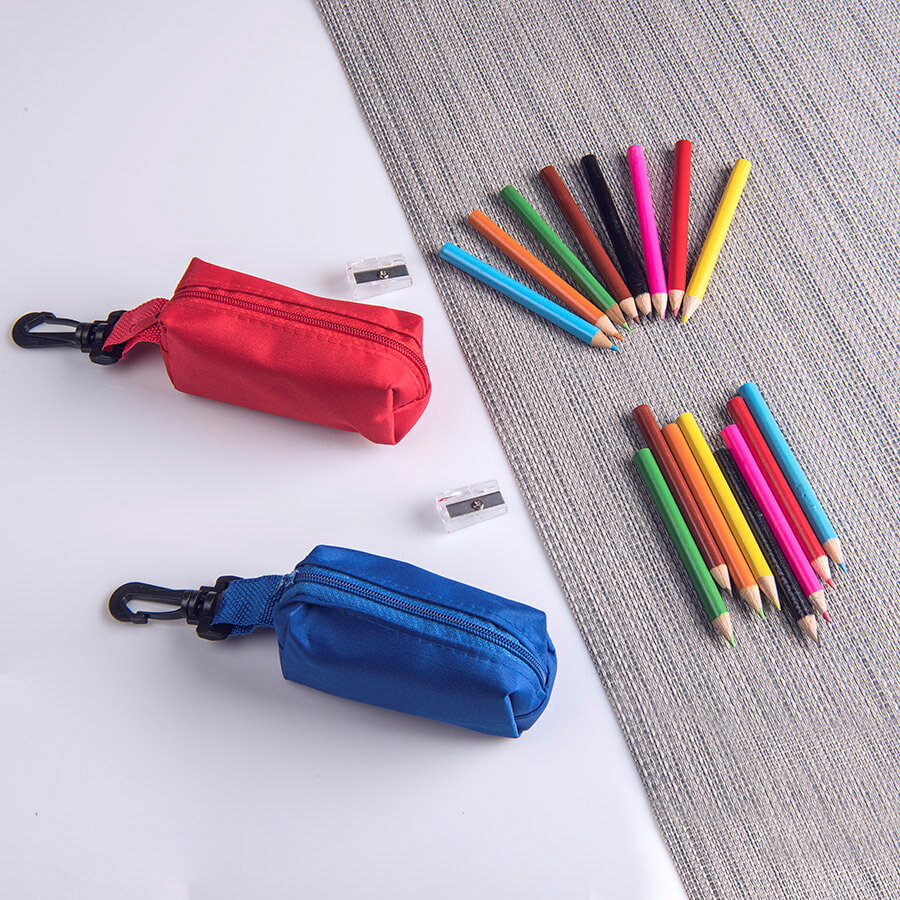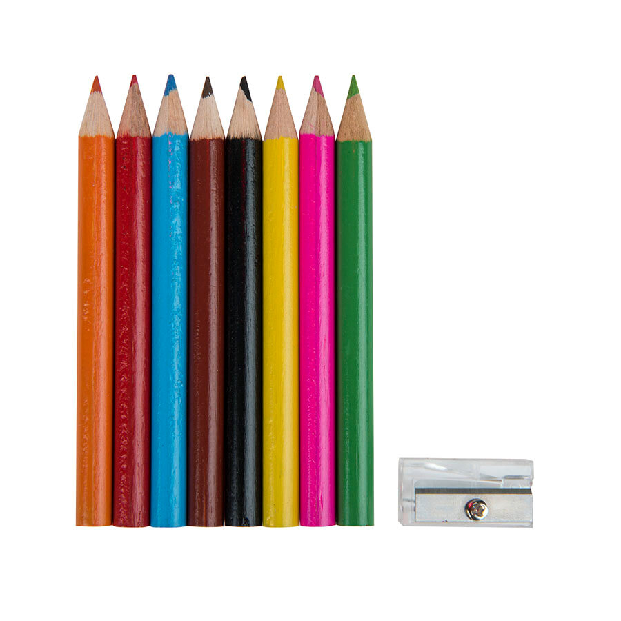 Цвета карандашей: голубой, красный, зеленый, желтый, оранжевый, розовый, коричневый, черный. Все карандаши заточены. Набор поставляется в текстильном чехле с карабином. Также в набор входит точилка из прозрачного пластика.