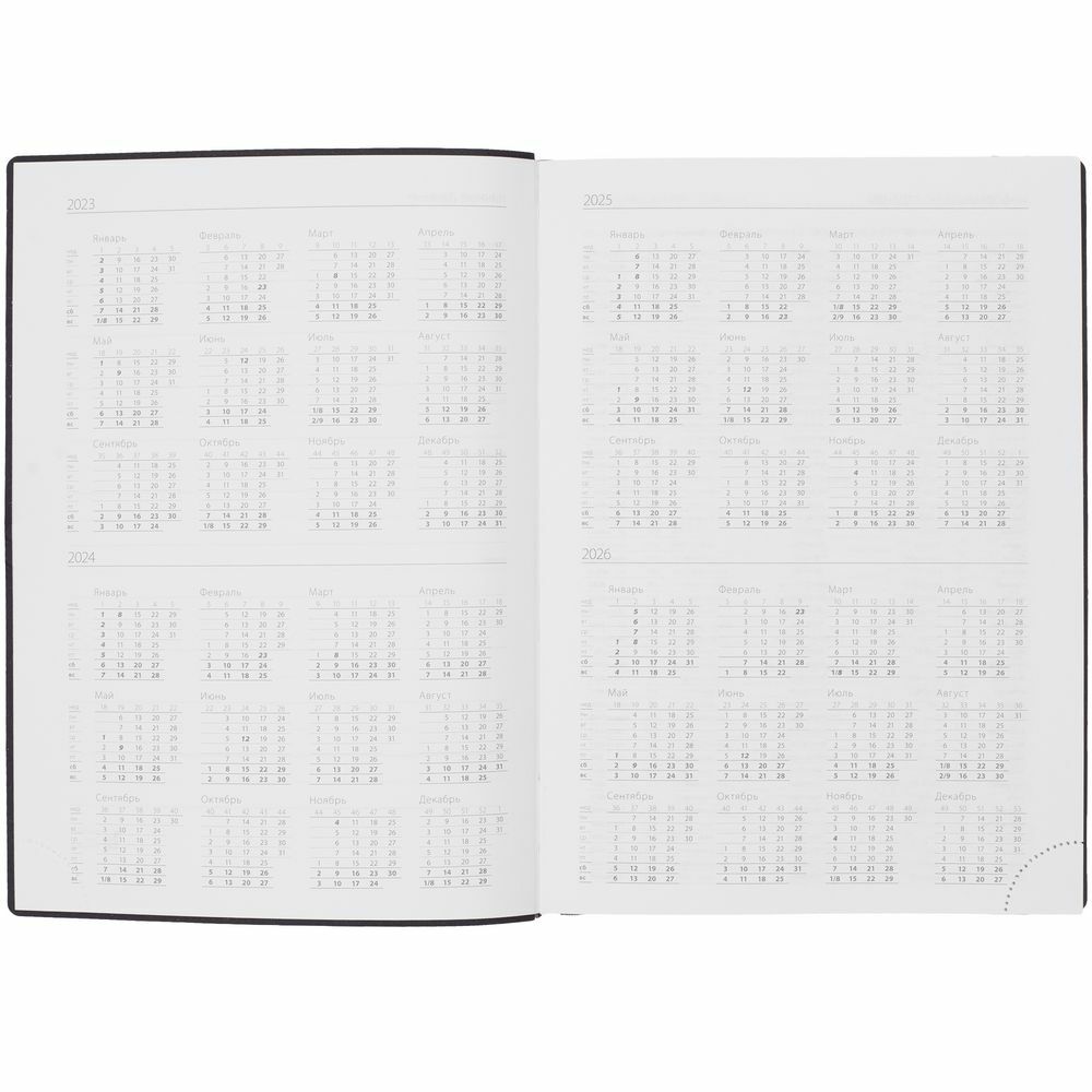 Ежедневник с гибкой обложкой выполнен из материала Latte, черный АА, и дополнен резинкой шириной 1 см, капталом и ляссе черного цвета.