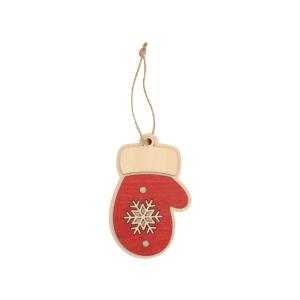 Трогательная елочная игрушка в виде новогодней варежки – атмосферный и праздничный сувенир. Подвеска изготовлена из березовой фанеры и украшена тонировкой красного цвета. Текстура натурального материала и объем игрушки, выполненной в два слоя, делают ее приятной не только внешне, но и тактильно.