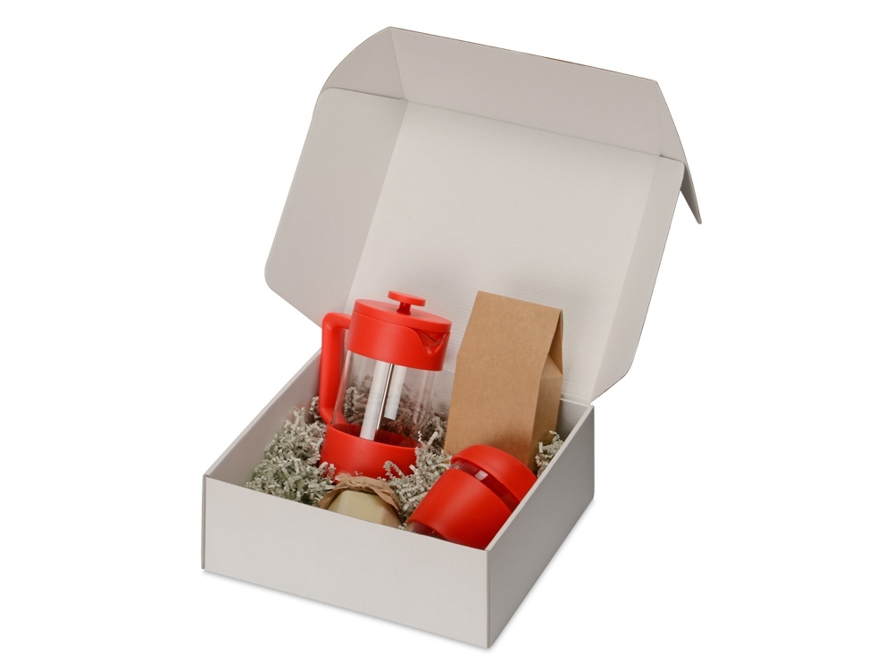 Набор "Бодрое утро" содержит все необходимое для действительно приятного пробуждения. В нем вы найдете все, что нужно для приготовления вашей первой чашечки кофе с утра: френч-пресс, упаковку робусты темной обжарки, стакан с силиконовыми деталями и баночку крем-меда, который составит прекрасную пару крепкому напитку. Набор упакован в белую картонную коробку и переложен бумажным наполнителем.
