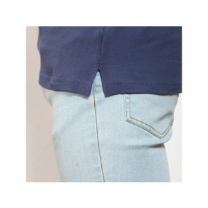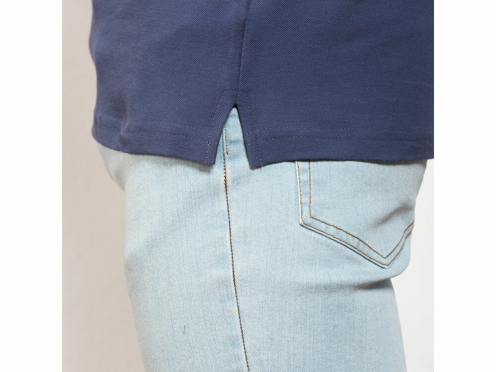 Поло с коротким рукавом, воротник и манжеты из риба 1х1, отделка горловины внутри тесьмой. Планка застегивается на 3 пуговицы. Разрезы в боковых швах.