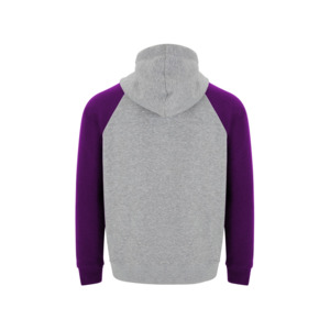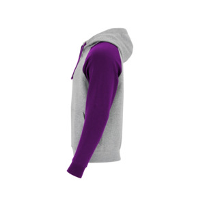 Худи с контрастным рукавом реглан. Капюшон с запахом, с контрастной подкладкой и шнурком. На полочке карман кенгуру. Манжеты рукавов и низ изделия из риба 1х1.