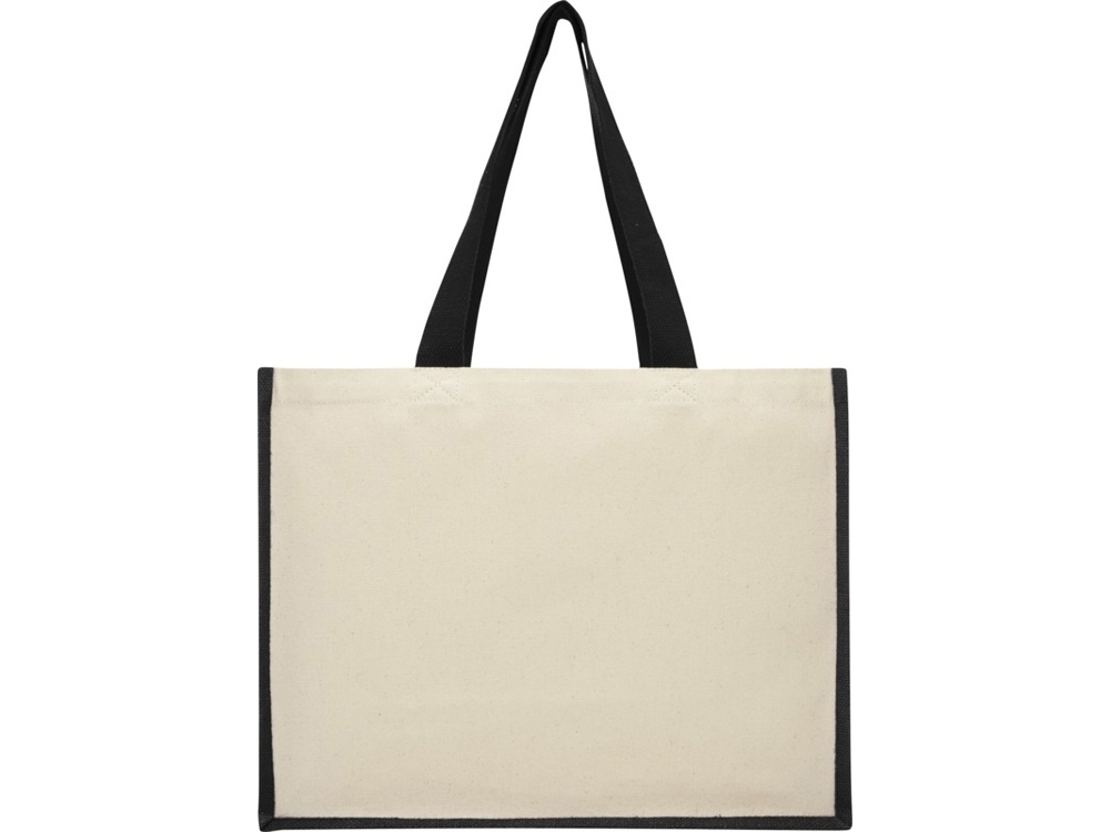 Модная сумка для покупок с боковыми панелями (вес 320 г/м²), подходящими для нанесения изображений, окантовкой из ламинированного джута и хлопковыми ручками.
