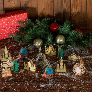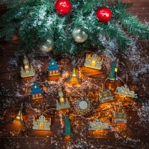 Новогодняя ёлочная гирлянда постоянного свечения с цветными фигурками достопримечательностей из натуральной березовой фанеры сделает процесс украшения ёлки или дома не только увлекательным, но и познавательным! Гирлянда состоит из 14 парных фигурок достопримечательностей и центрального элемента в виде снежинки. Снежинка и корпус батарейного блока имеют дополнительные съемные панели, которые поставляются в наборе в виде отдельных деталей и крепятся на изделие на двусторонний скотч. Эти элементы специально предназначены для нанесения и придания презенту уникальности. Гирлянда работает от 2-х батареек АА, которые входят в комплект. На гирлянде изображены следующие достопримечательности: Биг Бен (Лондон, Англия) Храм неба (Пекин, Китай) Эйфелева башня (Париж, Франция) Тадж-Махал (Агра, Индия) Статуя Свободы (Нью-Йорк, США) Сиднейская опера (Сидней, Австралия) Храм Василия Блаженного (Москва, РФ)