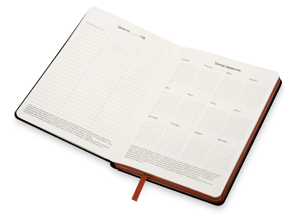 Бизнес-блокнот «Bossy» станет вашим ежедневным помощником не только в работе, но и в достижении личных целей. Информационный блок включает в себя страницы под цели и планы, трекер привычек — необходимые инструменты, которые не дадут ничего упустить из виду, а также отдельные страницы для подведения личных итогов года. В блокноте 256 страниц, даты не указаны, что позволяет начать вести блокнот в любой удобный день года. Карман для мелочей, резинки, петли для ручки на корешке и ляссе делают этот блокнот очень удобным и позволяют найти нужный раздел максимально быстро. Обложка выполнена из текстурной экокожи, цветной срез и фурнитура в тон делают «Bossy» очень стильным бизнес-аксессуаром. Корешок из экокожи с софт-тач покрытием очень приятен на ощупь. Бумага в «Bossy» гладкая, приятная на ощупь, писать на ней — одно удовольствие, а еще она произведена с заботой об экологии — имеет сертификат FSC. • 256 страниц в блоке, недатированный • Карман для мелочей на нахзаце • Наличие резинки, петли для ручки на корешке и ляссе • Специальные страницы для целей, записи идей, трекер привычек • Текстурная обложка • Наличие контрастных элементов