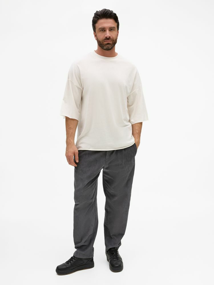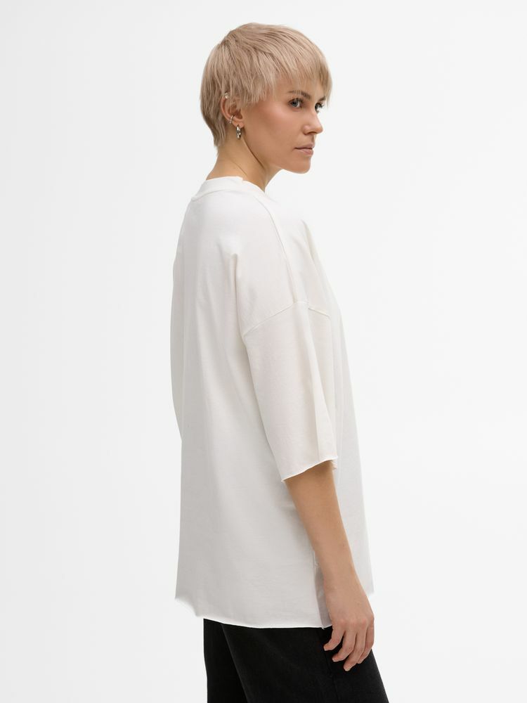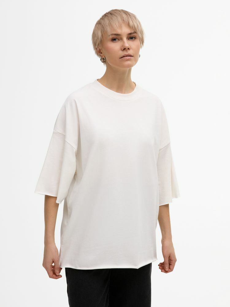 Футболка унисекс свободного кроя со спущенным плечом.