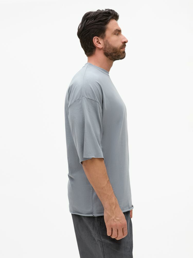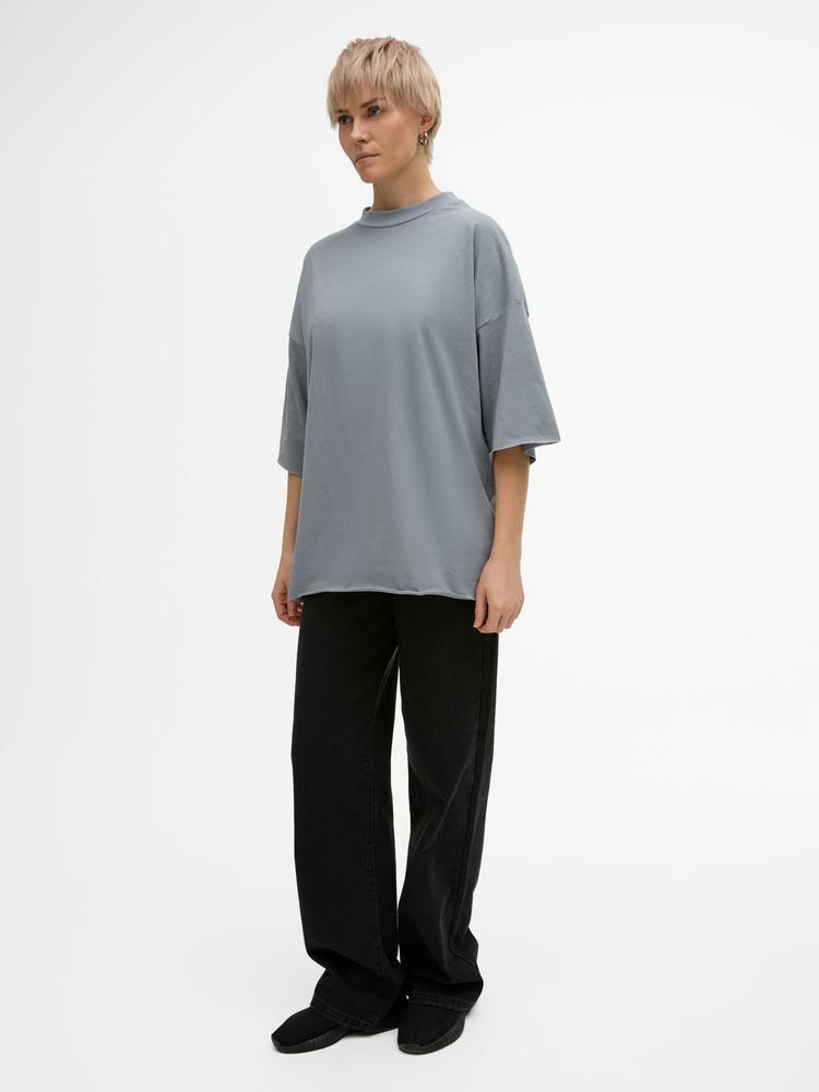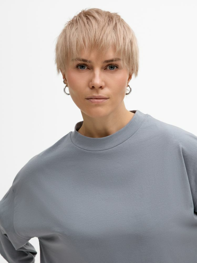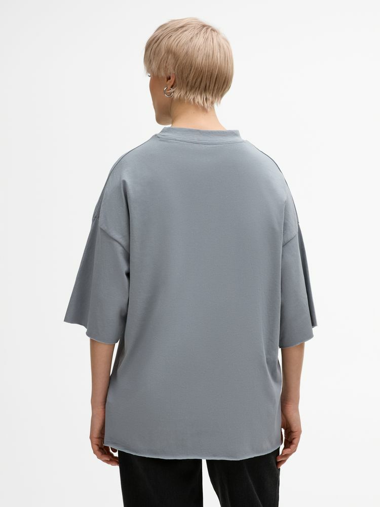 Футболка унисекс свободного кроя со спущенным плечом.