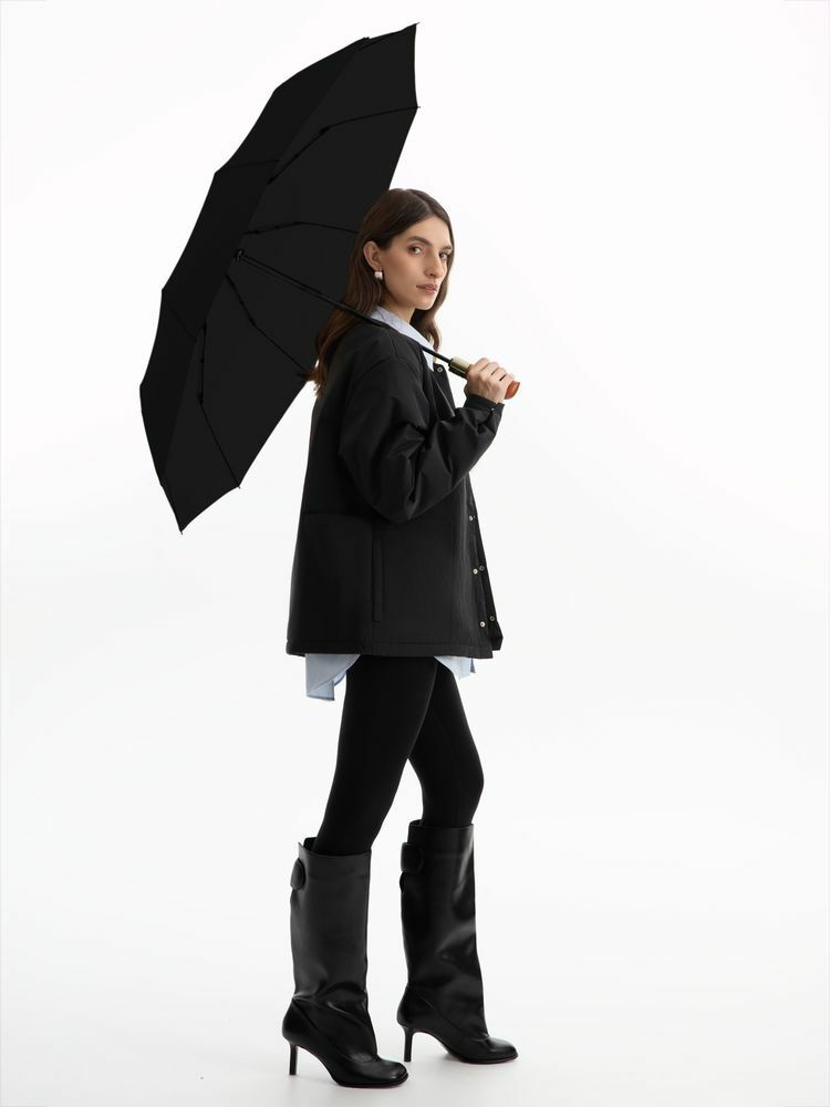Автоматический механизм позволяет раскрыться за секунду. Плотная ткань купола обеспечивает высокую прочность и устойчивость к разрывам, при этом оставаясь легкой. А ручка из натурального дерева обеспечивает комфортный захват и добавляет зонту благородности.