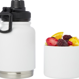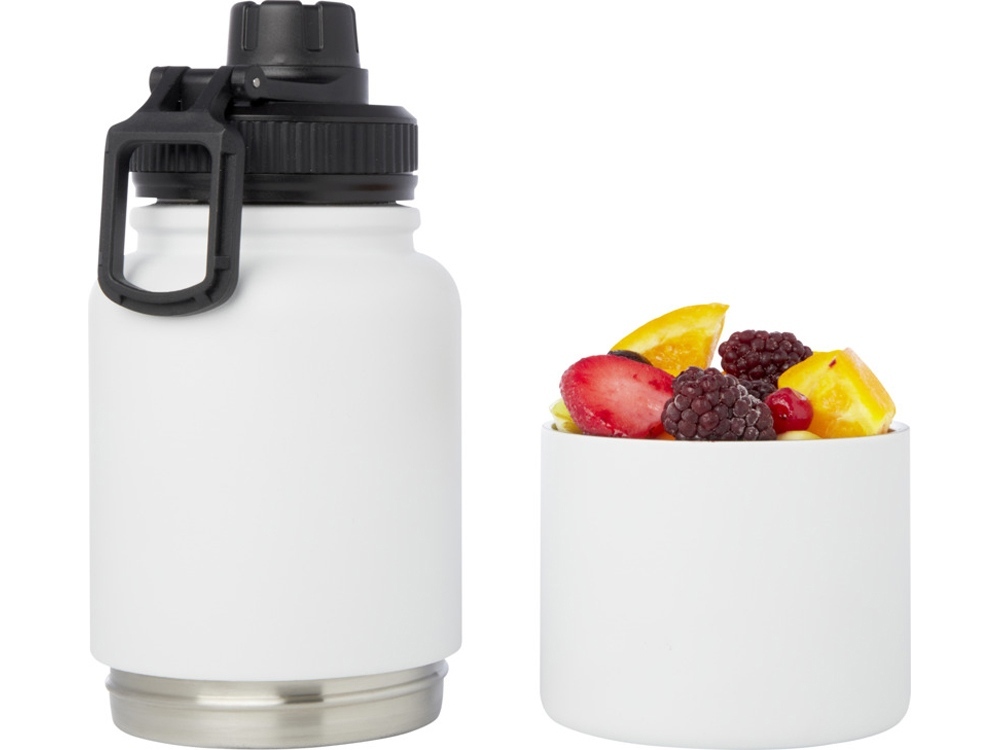 Многоразовая бутылка-термос из нержавеющей стали, сертифицированная RCS, со съемным контейнером для хранения. В верхней части бутылка имеет медный изолированный термос объемом 530 мл, который сохраняет напитки горячими или холодными в течение нескольких часов. Нижняя часть представляет собой контейнер с двойными стенками, вмещающий до 340 мл. Его можно использовать как чашку для любимых холодных напитков или для хранения закусок или других мелочей. Поставляется в подарочной коробке из переработанного картона. RCS certified recycled stainless steel, Recycled PP Plastic. Packaging: FSC Mix Credit P5.1 CU-COC-877277.