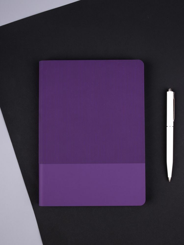 Ежедневник с гибкой обложкой выполнен из материала Soft Touch, фиолетовый UU и Latte, фиолетовый (внутренний материал); дополнен ляссе фиолетового цвета и фактурным тиснением обложки.