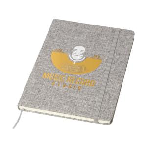 Блокнот формата А5 в твердой обложке из переработанного хлопка, 80 листов бумаги плотностью 70 г/м² в линейку. Блокнот имеет эластичную застежку, ленту и закругленные углы. FSC certified paper. FSC Mix Credit P7.1 CU-COC-877277.