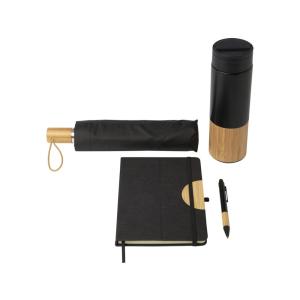 Подарочный набор Carmen включает блокнот формата А5 в твердой обложке, шариковую ручку, бутылку с водой и зонтик. Блокнот имеет черную эластичную застежку и ленточную закладку, а также 80 разлинованных листов бумаги плотностью 80 г/м² кремового цвета. Чехол для ноутбука вместе с бамбуковым полукругом выполняет функцию подставки для телефона. Шариковая ручка изготовлена из переработанного алюминия, сертифицированного RCS, с черным напылением и бамбуковой рукояткой. Чернила для ручки: черный. Длина непрерывной линии: 1000 метров. Бутылка для воды объемом 450 мл изготовлена из нержавеющей стали и украшена бамбуковым аксессуаром на дне. Только ручная мойка. Размер бутылки: 6,6 х 22,2 см. Зонт диаметром 21 дюйм имеет черный купол из эпонжа, черный металлический стержень, черные спицы из стекловолокна и бамбуковую ручку. Размер зонта: 28,3 x 5,5 см. Размер подарочной коробки: 36 x 30 x 8 см. . FSC certified paper, Recycled PET Polyester, Recycled Aluminium. #?0:>2:0: FSC Mix Credit P5.1 CU-COC-877277. FSC Mix Credit P7.1 CU-COC-877277.