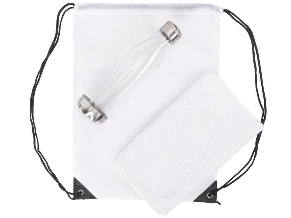 Универсальный спортивный набор будет актуален в любом виде спорта. Бутылка для воды позволит брать с собой не только воду, но и тонизирующие напитки или коктейли и поможет освежиться в любой момент. Тритан, из которого изготовлена бутылка, не искажает вкус и запах напитков, являясь абсолютно безопасным для человека. Натуральное полотенце из 100% хлопка не вызовет аллергии и не навредит коже. Вместительный рюкзак пригодится, чтобы всегда держать под рукой всё необходимое для тренировки. • объём бутылки: 700 мл • размер полотенца: 30х70 см • практичный набор для спортивного мерча