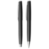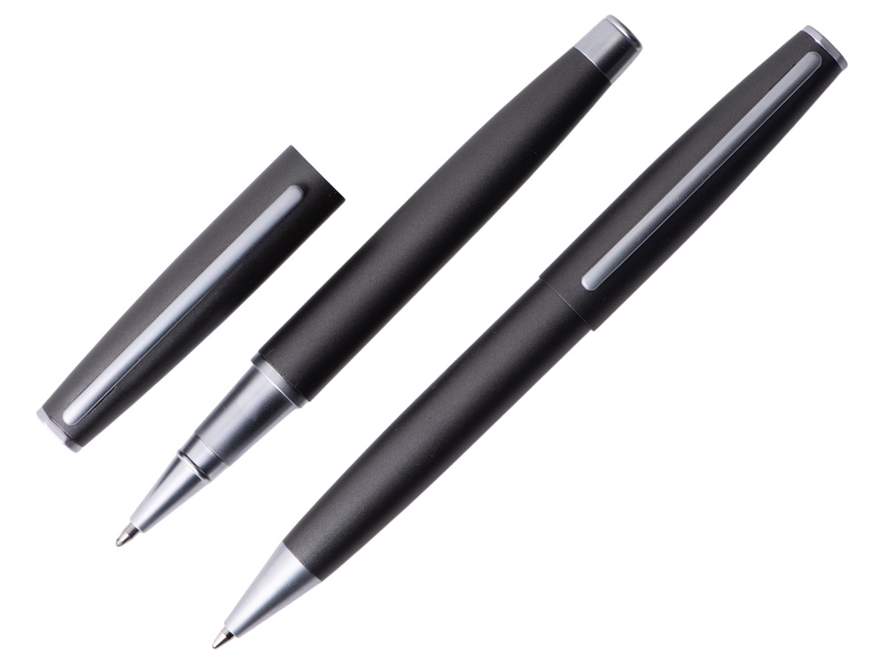 Статусный и функциональный набор состоит из двух металлических ручек - шариковой и роллера. Широкая форма помогает ручкам комфортно ложиться в руку и увеличивает площадь для нанесения логотипа. Швейцарский пишущий узел Premec и немецкие чернила Dokumental обеспечивают мягкое и плавное письмо. Ручки упакованы в классический чёрный матовый футляр с логотипом бренда Lettertone на дне. - набор в подарочной упаковке; - цвет чернил: синий; - идеальный вариант под гравировку.