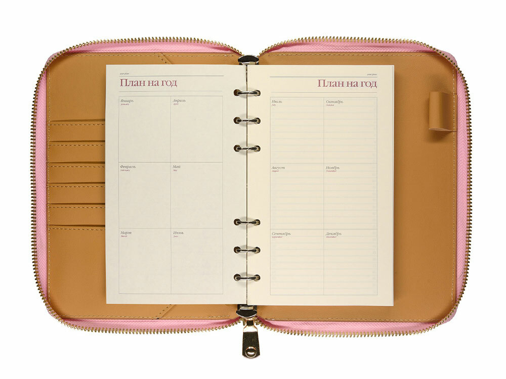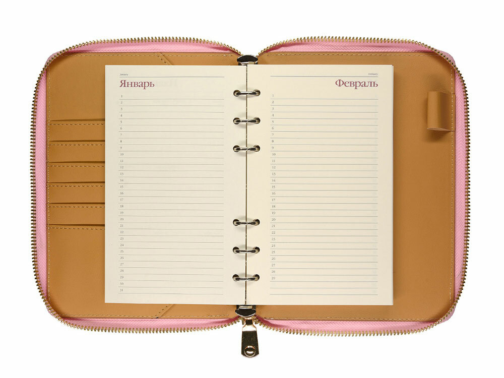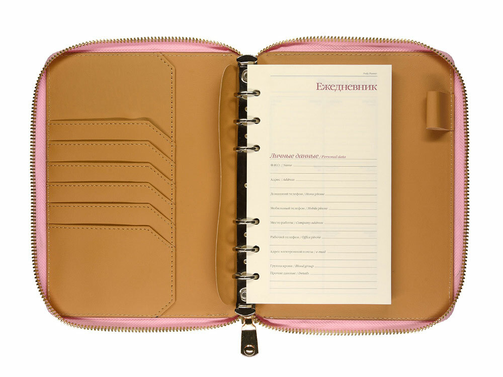 Деловая нежность! Вот как можно охарактеризовать этот очаровательный розово-зефирный ежедневник. Большое отделение на молнии вмещает в себя и сменный блок для записей на кольцевом механизме, и отделения для визиток и ручки. В этом бизнес-аксессуаре поместятся и дополнительные документы и смартфон.