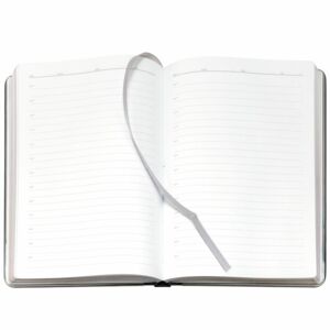 Ежедневник с твердой обложкой и серебристым обрезом, выполнен из материала Saffian, темно-серый, дополнен серым ляссе и металлическими рамками.