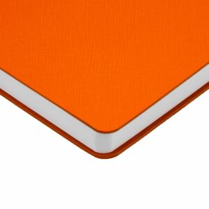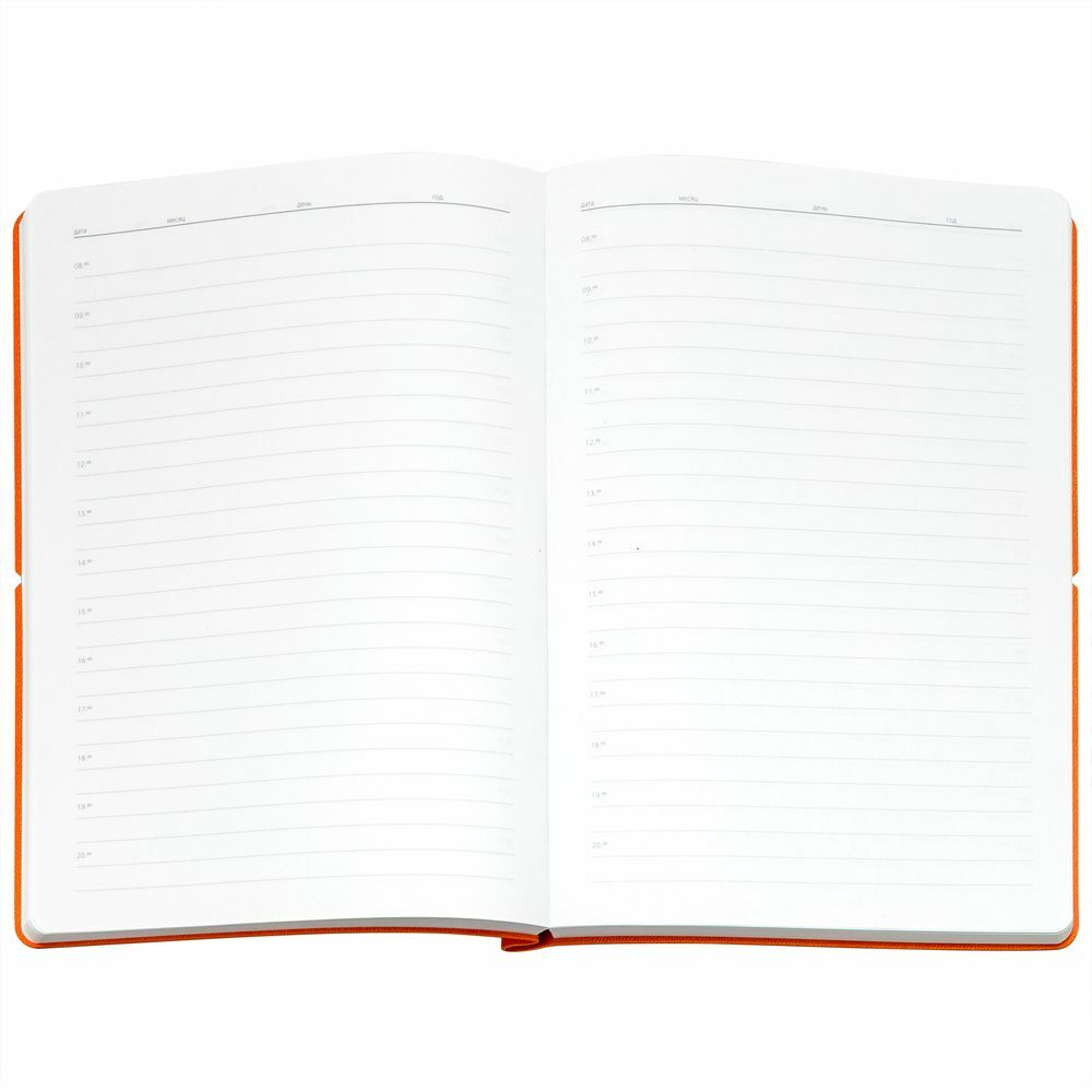 Ежедневник с гибкой обложкой выполнена из материала Nice Touch, оранжевый и Latte, оранжевый (внутренняя часть обложки), дополнен горизонтальной резинкой в цвет обложки. Внутри корешка — специальное место для крепления ручки размером до 15х1 см.
