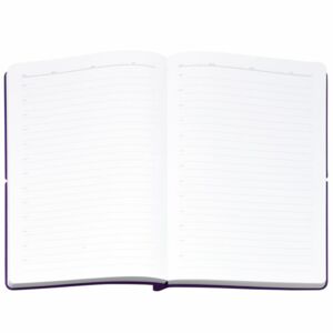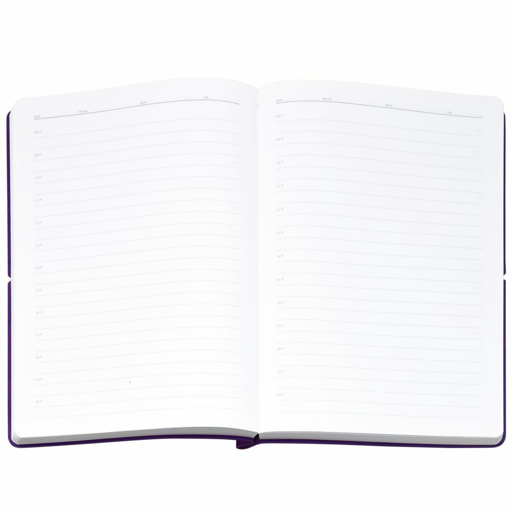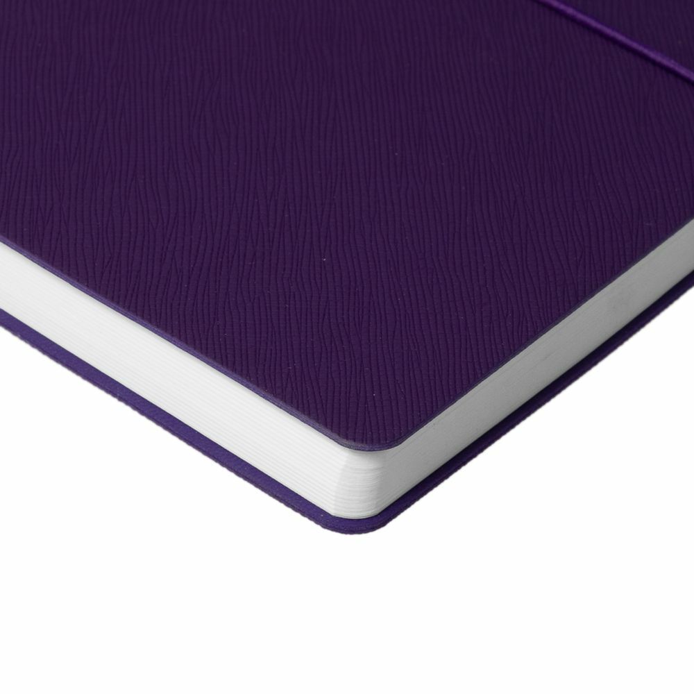 Ежедневник с гибкой обложкой выполнена из материала Nice Touch, фиолетовый и Latte, фиолетовыйl (внутренняя часть обложки), дополнен горизонтальной резинкой в цвет обложки. Внутри корешка — специальное место для крепления ручки размером до 15х1 см.