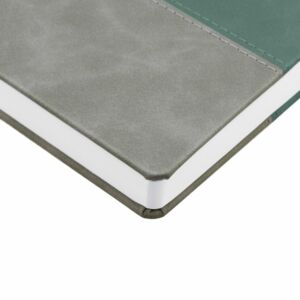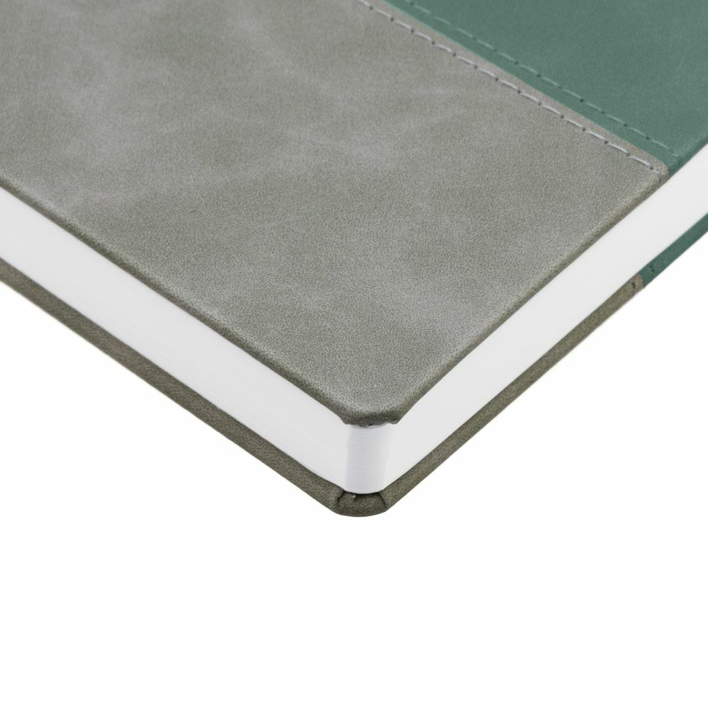 Ежедневник с твердой обложкой, без поролона, со сшивкой материалов Nubuck Touch, серый СС, и Nubuck Touch зеленый FF, дополнен двойным ляссе и петлей-резинкой для ручки.