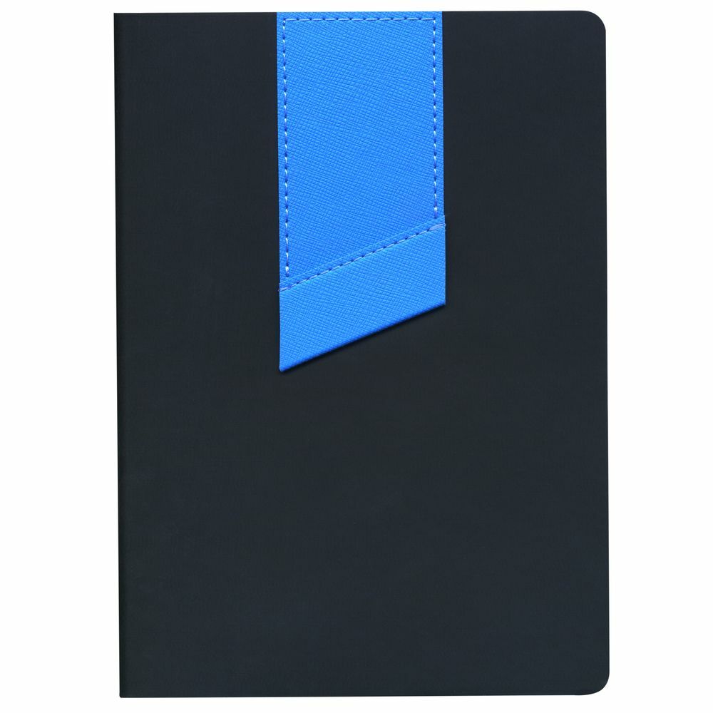Ежедневник с гибкой обложкой, выполнен из материала Soft Touch, черный АА, дополнен петлей для ручки из материала Nice Touch, голубой JJ и цветным ляссе.