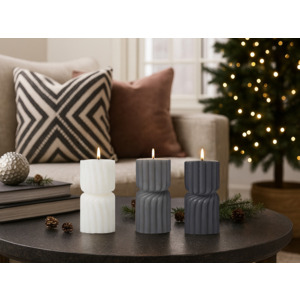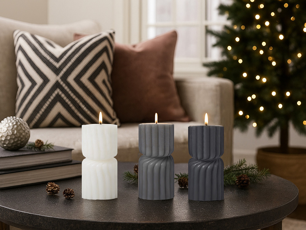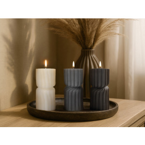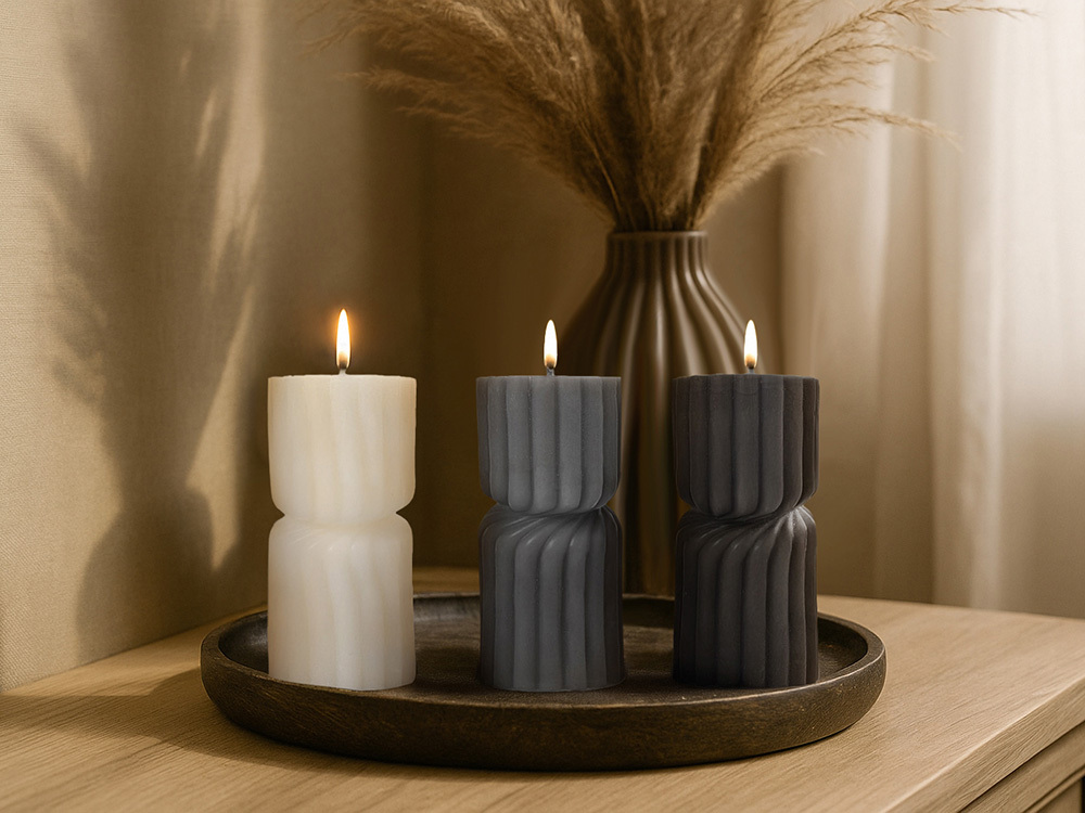 Стильные свечи с формой, вдохновлённой античной архитектурой, станут акцентом вашего интерьера и источником особого настроения. Форма: утончённые вертикальные линии и грани, создающие игру света и тени. Ароматы: - свежий бергамот с нотами ванили; - тёплый цветочный мёд; - глубокая кубинская сигара. Цвета: тёмно-серый, серый, белый — универсальное сочетание для любого интерьера. Материал: высококачественный воск для ровного и чистого горения.