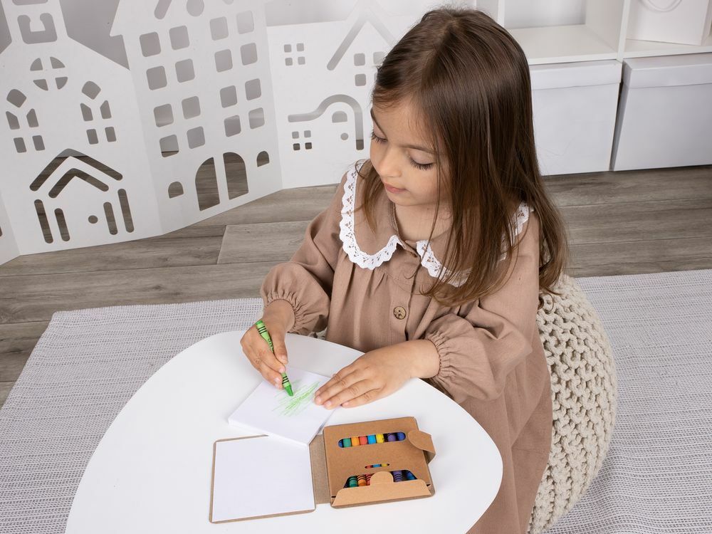 В комплекте 11 цветных восковых мелков и блокнот на 40 страниц для раскрашивания и рисования: 12 страниц с рисунками и 28 чистых страниц. Блокнот и мелки компактно хранятся под одной обложкой.
