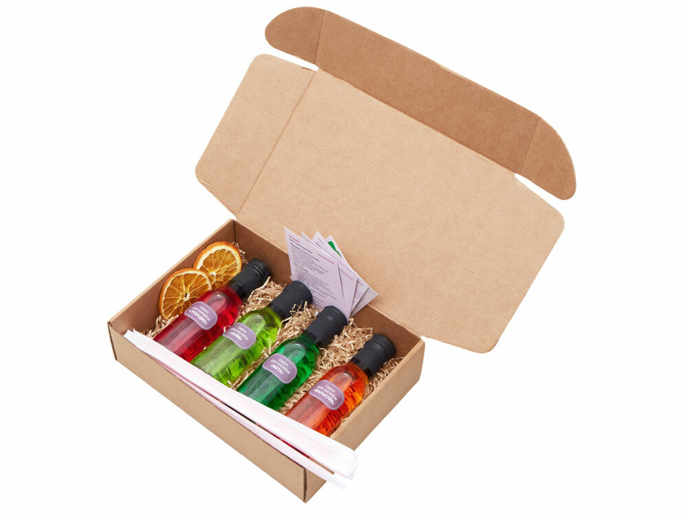Подарочный набор, который превращает любой вечер в маленький праздник. В стильной упаковке собраны: - 4 бутылочки сиропов по 100 мл с яркими вкусами: Лайм, Маракуйя, Мята, Гренадин – классика коктейльного бармена. - 6 трубочек для коктейлей. - Подобранные специи для изящного декора напитков. - 4 карточки с рецептами – готовые идеи для быстрого приготовления коктейлей. Такой набор – универсальный и статусный подарок для партнёров, клиентов или сотрудников. Он подчеркнёт внимание к деталям, создаст атмосферу гостеприимства и станет стильным акцентом любого корпоративного мероприятия. В комплект входит: - бутылки с сиропом для коктейлей 100 мл: "Лайм", "Маракуйя", "Мята", "Гренадин" - трубочки для коктейля 6 шт. - специи для декора коктейля - карточки с рецептами 4 шт.
