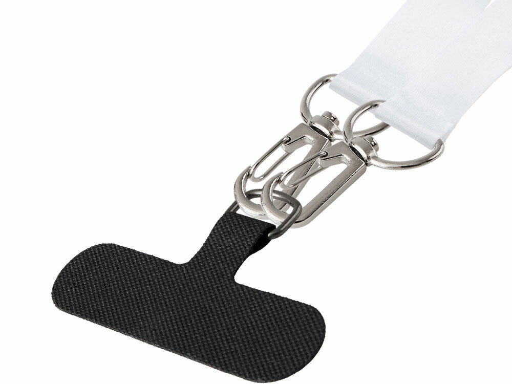 Ланъярд 2 см под сублимацию с 2-мя трендовыми карабинами и узким держателем для телефона из ПЭ, серебристый в ассортименте цветов, материалов и моделей
