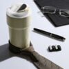 Смарт-термостакан в металлическом корпусе с легким рельефом.