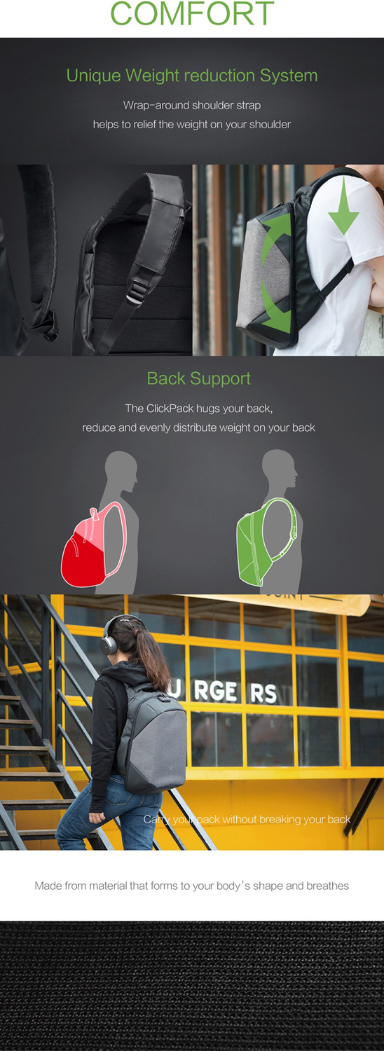 Вместительный рюкзак для путешественников ClickPack Pro из комбинации серого и черного цветов, обладатель премий Good Design Award 2017, Red Dot Design Award 2018, iF Design Award 2018, CMF Design Award, China Red Star Design Award, International Design Excellence Award, Upstyle Award 2018. Размер рюкзака 46х34х16 см, объем 17,3 л, вес 1310 гр. Сделан из высокопрочного устойчивого к порезам и трению водоотталкивающего материала многослойного плетения из разных типов ткани: нейлон, полиэстер и стекловолокно. Не требует специального ухода. Конструкция достаточно жесткая, не деформируется. Детально продуманная организация отделений позволяет грамотно распределить вес. Самые тяжелые предметы располагаются ближе к спине, например, в отделении размером 34х26х3 см для ноутбука диагональю до 15,6” и в кармане размером 19х25 см для планшета диагональю до 10”. Благодаря плотным перегородкам ноутбук и планшет надежно фиксируются и не перемещаются при ходьбе. Специальная анатомическая конструкция и вентилируемая мягкая спинка снижают нагрузку на плечи и спину, вес рюкзака воспринимается на 20-25% легче, чем при использовании стандартных моделей рюкзаков. Конструкция рюкзака позволяет раскрыть его на 180°, чтобы аккуратно уложить в рюкзак много различных предметов. Дополнительно в основном отделении расположены еще 9 карманов различного функционала. 7 открытых карманов под ручки и различные мелочи, 2 кармана на молниях размерами 8х18 см и 12х25 см, в который можно поместить powerbank, т к в него приходит USB-кабель (600 мм, 0,5-0,7 А, 5В), соединенный с портом на внешней стороне рюкзака для легкого подключения к смартфону. Это оригинальная запатентованная система зарядки K EasyCharging 1.0 с помощью USB-порта, расположенного в борту рюкзака, и кабеля, идущего к powerbank, что делает мобильную зарядку более удобной. В комплекте идут 2 органайзера для туалетных принадлежностей и электронных аксессуаров, которые можно зафиксировать внутри рюкзака на липучках, и специальный тканевый чехол с RFID-защитой размером 13х19,5 см. В сильный дождь на рюкзак можно одеть специальный непромокаемый чехол, который защитит его содержимое даже под ливнем или от брызг при поездке на велосипеде или мотоцикле. Рюкзак закрывается на молнию YKK, которую можно зафиксировать с помощью кодового замка TSA007 с функцией таможенного досмотра. Широкие и прочные лямки крепятся к небольшому тканевому борту, что позволяет рюкзаку как бы обхватывать вашу спину. В одном из бортов расположен USB-порт, а в другом - чехол для зонта или бутылки с водой, который при использовании фиксируется специальным креплением. На правой лямке рюкзака находится easy access карман размером 12х6 см на молнии, на левой - открытый карман 10х5 см. На внешней стороне рюкзака в стыке серого и черного цветов спрятался треугольный карман на молнии размером 16х9 см с застежкой фастекс для ключей, которая позволяет вам легко отстегнуть/пристегнуть ключи. На спинке рюкзака расположен внешний потайной карман размером 15х29 см на молнии. Для его защиты достаточно того, что он вплотную прилегает к вашей спине и вытащить что-то из него без снятия рюкзака невозможно. В дополнение к вышеперечисленным средствам защиты рюкзак ClickPack Pro оснащен стальным тросом, которым можно обхватить неподвижный предмет и затем зафиксировать в кодовом замке. Сверху расположена ручка из полиуретана, за которую при необходимости удобно нести рюкзак в руках или закрепить 
