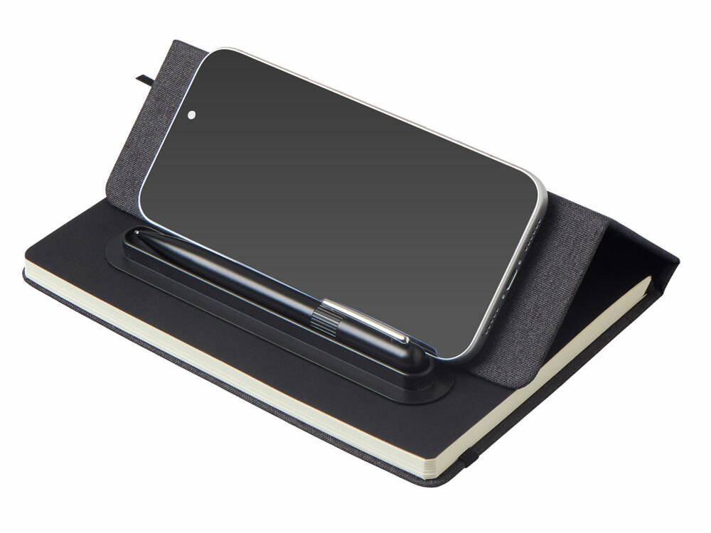 Набор блокнот А5 с магнитным держателем для ручки и подставкой для телефона и металлической шариковой ручкой "NotaBene", черный в ассортименте цветов, материалов и моделей