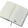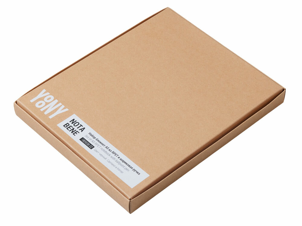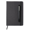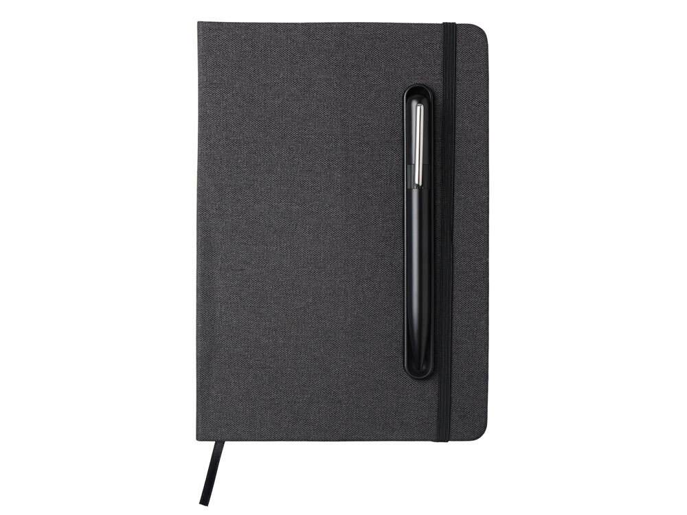 Блокнот в твердой обложке из rpet-пластика с металлической шариковой ручкой. В обложке магнитный держатель для ручки. Также верхняя часть обложки трансформируется в подставку для телефона.