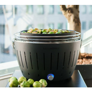 Угольный гриль округлой формы. Благодаря особой конструкции нижняя часть гриля не нагревается, его можно размещать даже на чувствительных поверхностях.