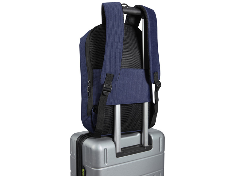 Рюкзак Luma для ноутбука 15 дюймов с защитой от кражи, изготовленный из переработанного жаккардового полиэстера с подкладкой из переработанного ПЭТ-пластика в тон, сочетает в себе умную защиту и элегантный стиль для тех, кто всегда в движении. Функции защиты от кражи включают запирающиеся молнии (замок не входит в комплект) и скрытый задний карман, который также можно использовать как ручку для крепления к чемодану. Ткань водоотталкивающая, что защитит ваши вещи от небольшого дождя. Внутри вы найдете отделение для ноутбука с диагональю экрана до 15 дюймов, имеющее мягкую подкладку для устройств, специальный карман для планшета, органайзер для ручек и организованное хранилище для аккуратного хранения самых необходимых вещей. Конструкция также включает мягкие плечевые ремни, дышащую сетчатую спинку и металлические пластины спереди. Независимо от того, едете ли вы на велосипеде на работу, проезжаете через оживленный аэропорт или направляетесь на учебу, рюкзак Luma обеспечит вам комфорт и стиль на весь день. Полиэстер из переработки, сертифицированный GRS.