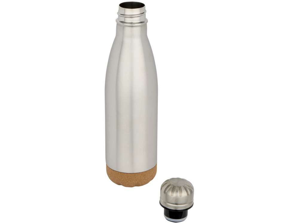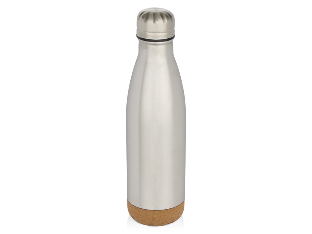 Бутылка для воды из нержавеющей стали с вакуумной изоляцией и пробковыми деталями в нижней части. Двойная изоляция стенок сохраняет напитки горячими или холодными в течение нескольких часов. Поставляется в подарочной коробке из переработанного картона. Объем: 500 мл. 90% нержавеющая сталь, 10% Пробка. упаковка FSC Mix Credit P5.1 CU-COC-877277.
