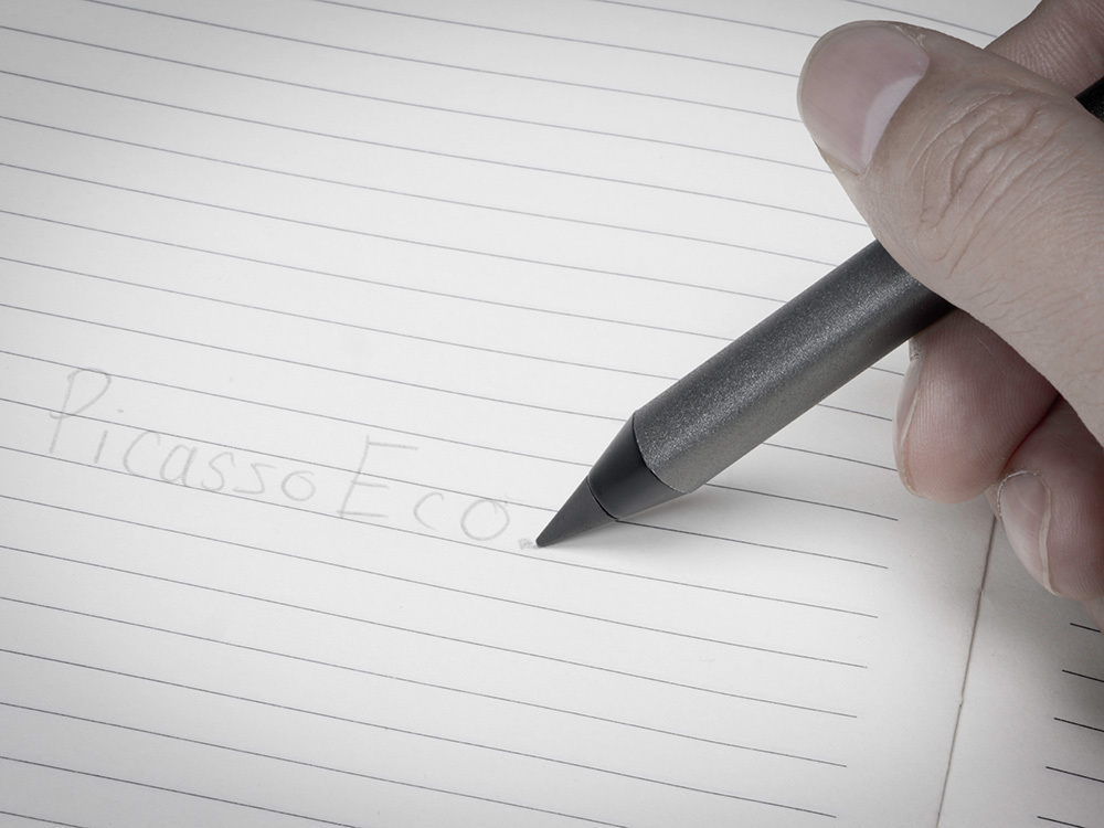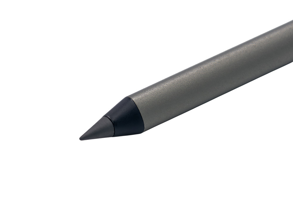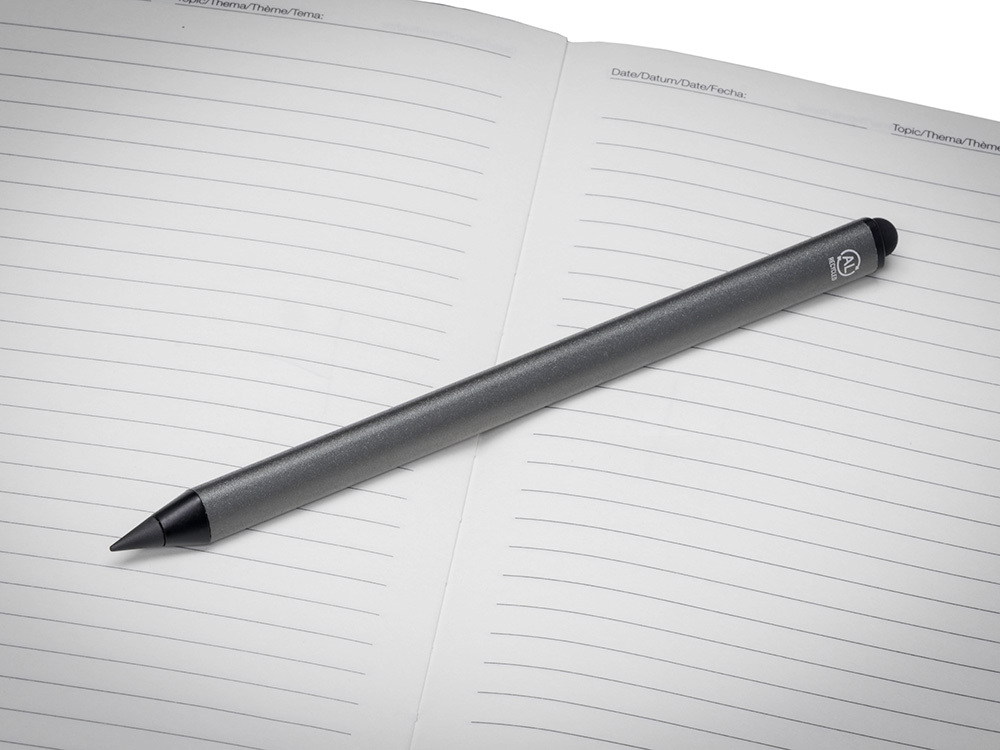 Карандаш изготовлен из переработанного алюминия. В отличие от обычных карандашей его не нужно точить, и он не пачкает руки.