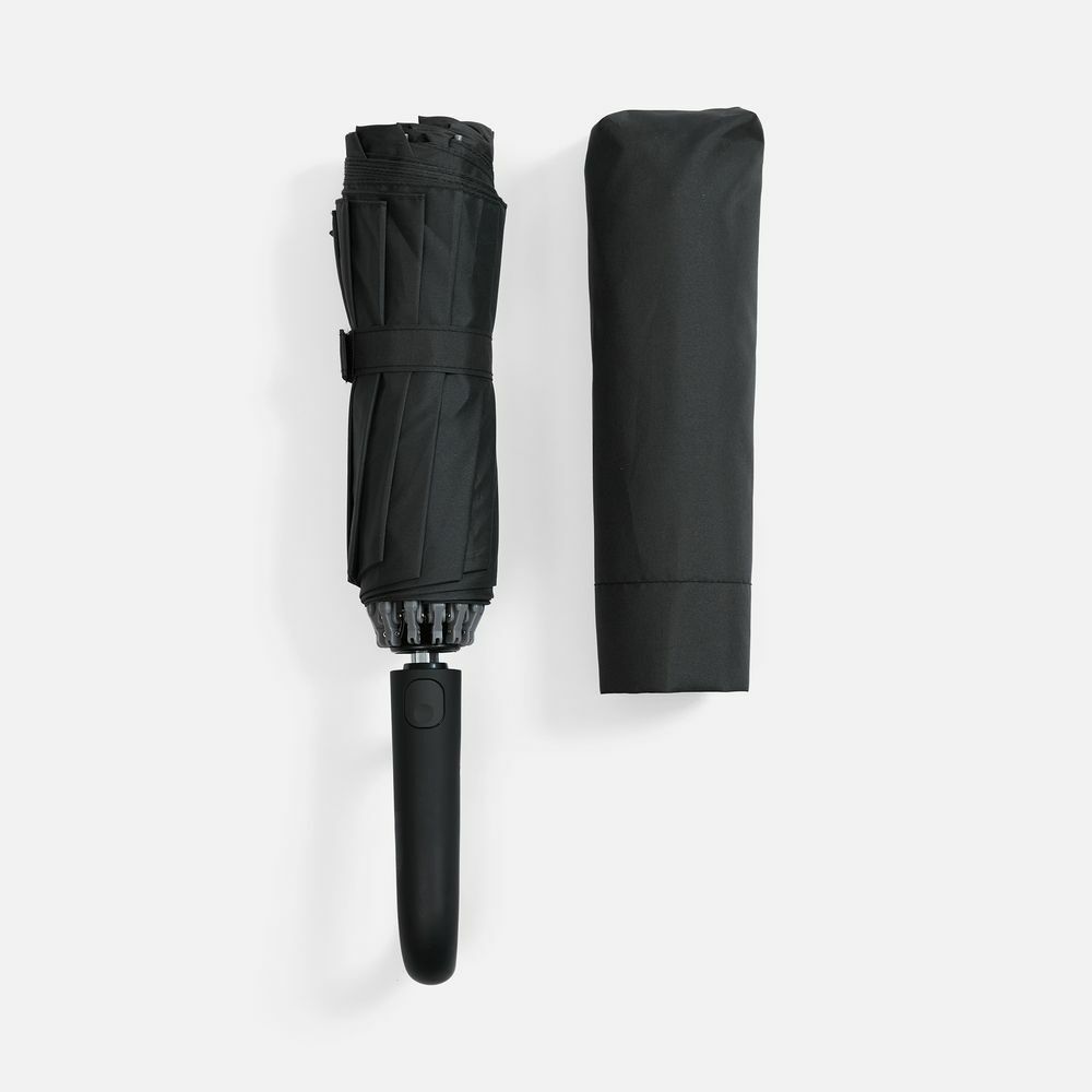 Преимущество обратного сложения заключается в том, что при закрытии внутренняя поверхность зонта остается снаружи, а мокрая сторона — внутри. За ручку-карабин удобно подвесить зонт на рюкзак или сумку.