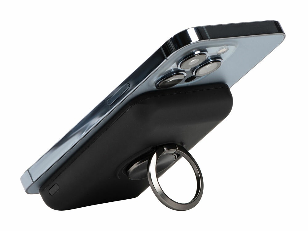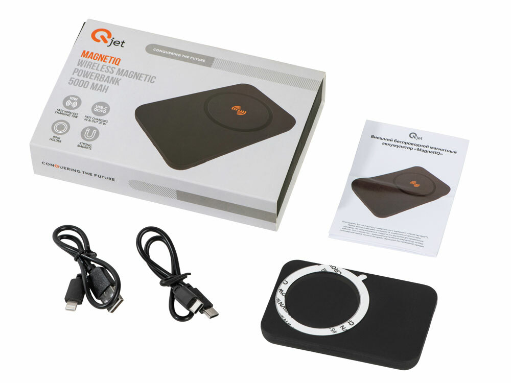 MagnetIQ надежно крепится к iPhone от 12 версии и новее при помощи сильных встроенных магнитов и заряжает по быстрой беспроводной зарядке 10 Вт. Также пауэрбэнк быстро заряжается по двойному USB-C кабелю из комплекта (при наличии USB-C сетевого адаптера мощностью от 18 Вт), и может заряжать быстро другие устройства по USB-C и USB-A портам. Внешний аккумулятор имеет встроенный металлический держатель-подставку на задней стороне, благодаря чему удобно держать заряжаемый смартфон в руках или устанавливать смартфон на рабочем столе. В комплекте есть металлическое кольцо для беспроводной зарядки смартфонов без встроенных магнитов. В базовой комплектации - двунаправленный кабель USB-C с поддержкой быстрой зарядки и кабель для проводной зарядки прежних iPhone USB - Lightning. • быстрая зарядка 20 Вт по USB-C "себя" и заряжаемых устройств • сильные магниты для беспроводной зарядки iPhone по технологии MagSafe • компактный, не перекрывает камеры смартфонов • металлический держатель-подставка в форме кольца