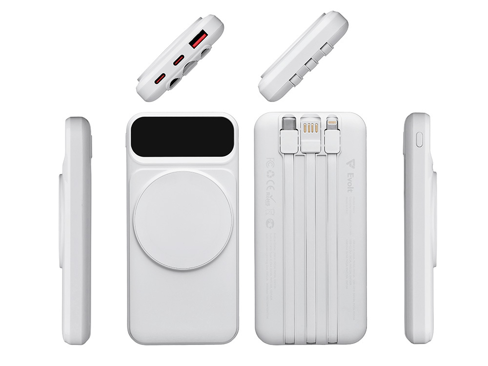 Функциональный и удобный внешний аккумулятор на 10 000 мАч обеспечивает быструю зарядку как по кабелям, так и беспроводным способом, поддерживая современные стандарты скорости. Цифровой дисплей на верхней панели мгновенно показывает точный уровень заряда, а встроенные кабели Lightning, USB-C и входной USB-A устраняют необходимость в дополнительных проводах — всё, что нужно для каждодневного использования, уже есть в самом гаджете. Компактные габариты, сопоставимые с размером смартфона, делают устройство идеальным для путешествий и повседневного использования. Сильные магниты гарантируют надёжное крепление при беспроводной зарядке. В комплекте есть силиконовая накладка: перед использованием удалите защитный стикер и прикрепите её к корпусу. - Встроенные кабели (Lightning, USB-C, USB-A) — не нужно искать дополнительные кабели: зарядка других устройств и подзарядка аккумулятора происходят через встроенные кабели. - Сильные магниты - Цифровой дисплей уровня заряда и статуса зарядки - Функции быстрой проводной и беспроводной зарядки - Упаковка с удобным и быстрым открытием