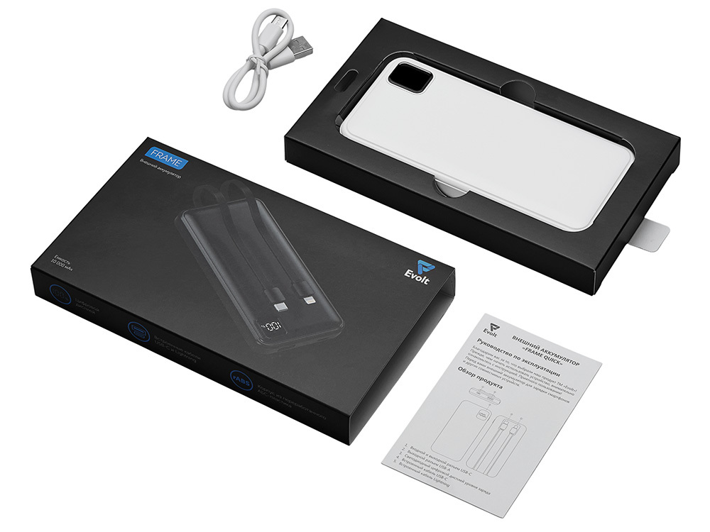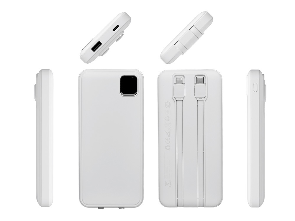 Удобный внешний аккумулятор с встроенными кабелями USB-C и Lightning — ваш надежный партнер в путешествиях, на встречах и в повседневных задачах. Цифровой дисплей в реальном времени показывает точный остаток заряда, а компактные габариты делают его таким же удобным, как смартфон. Прочный корпус из переработанного АБС-пластика и емкость 10000 мАч обеспечивают долгую работу даже при интенсивном использовании. Идеальный выбор для тех, кто ценит комфорт и функциональность в одном устройстве. Продуманная упаковка: для открытия просто потяните за язычок, и появится гаджет с нанесением. - Встроенные кабели USB-C и Lightning — больше не нужно искать провода - Цифровой дисплей с точным отображением заряда - Удобная зона под нанесение логотипа - Компактный размер, сопоставимый с телефоном — легко помещается в карман, сумку или портфель. - Упаковка с удобным и быстрым открытием