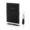 Лаконичный набор включает самые необходимые предметы для повседневного использования. В набор входит: • Брелок Swiss Peak с глянцевым металлическим покрытием и элегантным ремешком из искусственной кожи • Стильная шариковая ручка с запасом синих чернил, позволяющих провести линию длиной до 1000 метров • Блокнот с мягкой обложкой из переработанного полиэстера и 160 страницами кремового цвета из переработанной бумаги Все предметы в этом наборе имеют сертификат RCS (Recycled Claim Standard), что гарантирует полностью отслеживаемую цепочку поставок использованных переработанных материалов. В совокупности продукты в наборе состоят на 75% из переработанного сырья