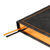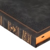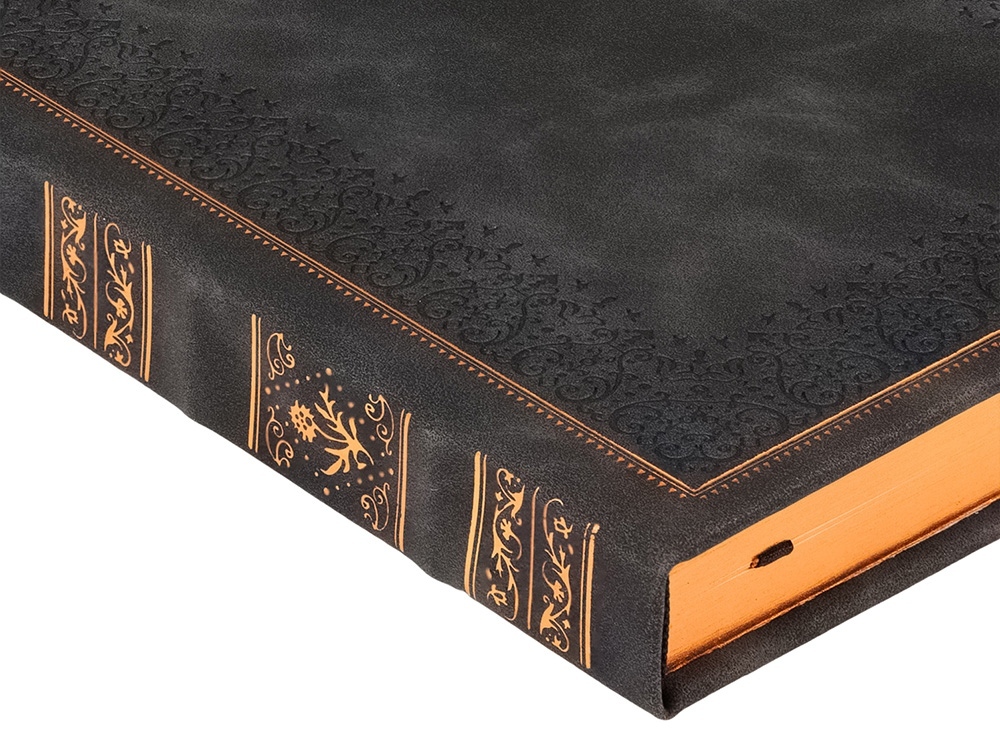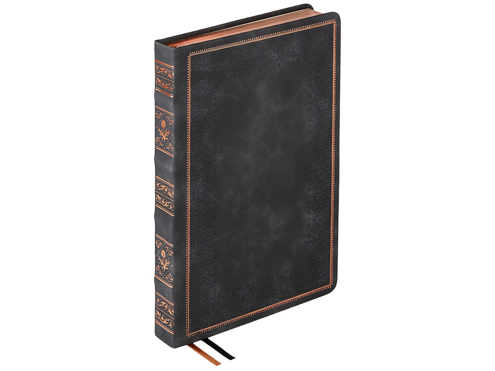 Недатированный ежедневник "Royal" формата А5 с твердой обложкой из искусственной кожи с имитацией нубука украшен художественным бронзовым и блинтовым тиснением. Внутри 256 страниц, выполненных из качественной бежевой бумаги в линейку плотностью 100 г/м². Два шелковых ляссе в цвет обреза блока и обложки облегчают навигацию по записям. Французский корешок дополнительно декорирован изящным бронзовым тиснением в виде виньеток. Скругленные углы обложки и блока подчеркивают стильный дизайн изделия, а блеск бронзового обреза дарит ежедневнику благородный и роскошный внешний вид.