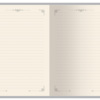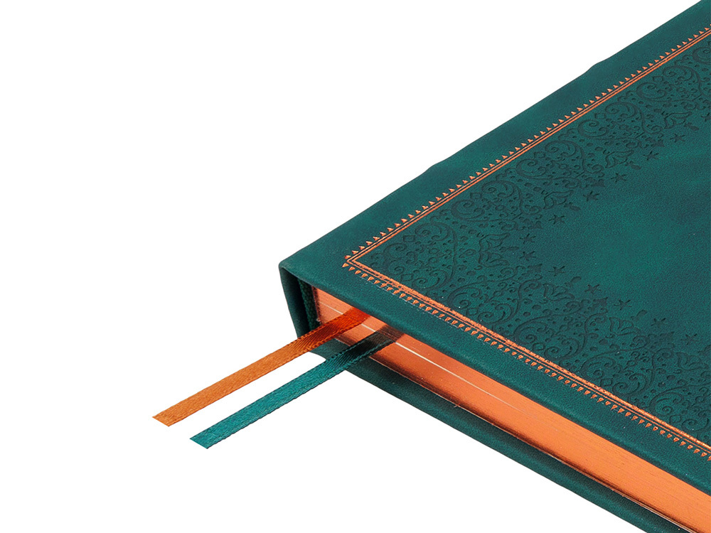 Недатированный ежедневник "Royal" формата А5 с твердой обложкой из искусственной кожи с имитацией нубука украшен художественным бронзовым и блинтовым тиснением. Внутри 256 страниц, выполненных из качественной бежевой бумаги в линейку плотностью 100 г/м². Два шелковых ляссе в цвет обреза блока и обложки облегчают навигацию по записям. Французский корешок дополнительно декорирован изящным бронзовым тиснением в виде виньеток. Скругленные углы обложки и блока подчеркивают стильный дизайн изделия, а блеск бронзового обреза дарит ежедневнику благородный и роскошный внешний вид.