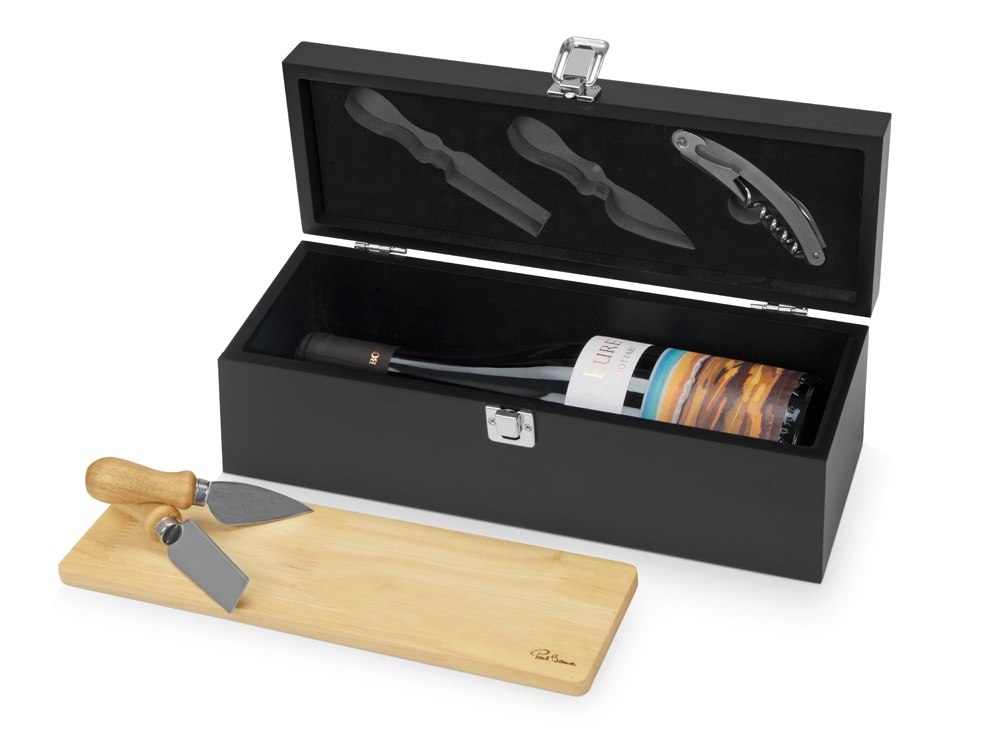 Набор Mino для вина и сыра. Коробка для вина со штопором и деревянная доска с двумя ножами для сыра. Вино и сыр не входят в набор. Набор упакован в деревянную коробку. Дерево и нержавеющая сталь.