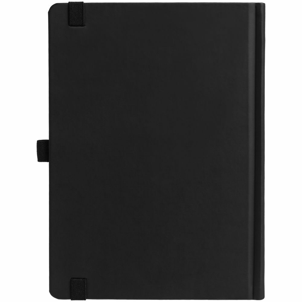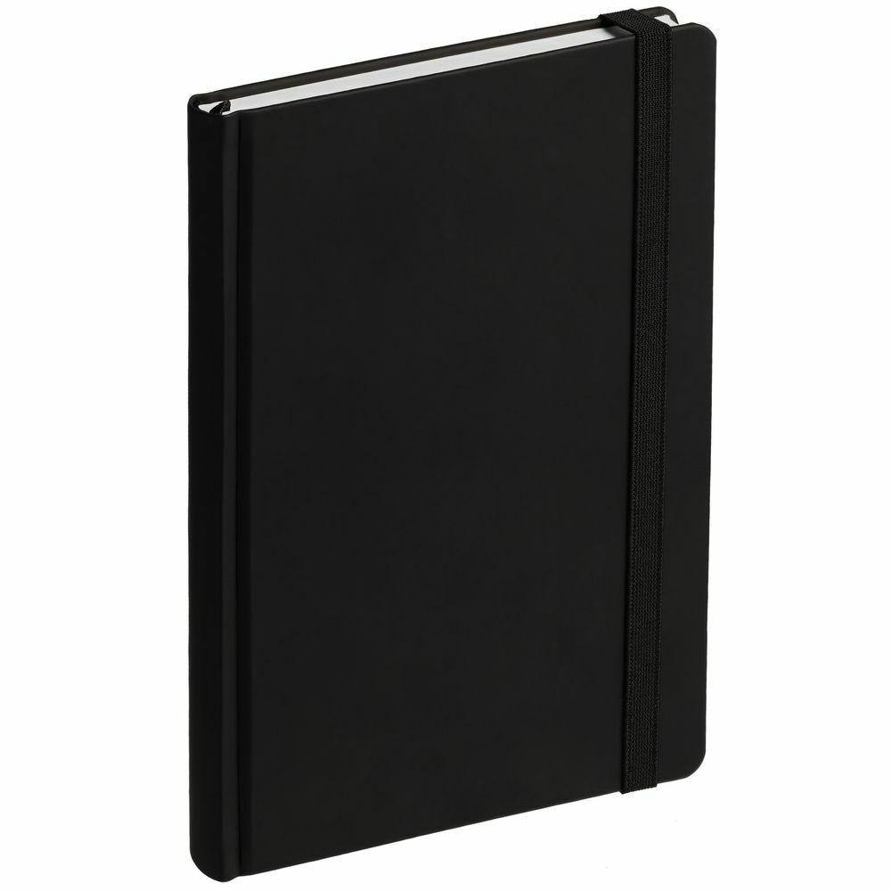 Ежедневник с твердой обложкой без поролона, выполнен из материала Soft Touch, черный АА, дополнен резинкой шириной 1 см, петлей-резинкой для ручки, капталом и ляссе черного цвета.