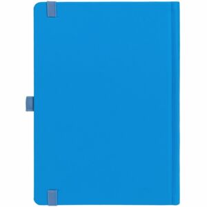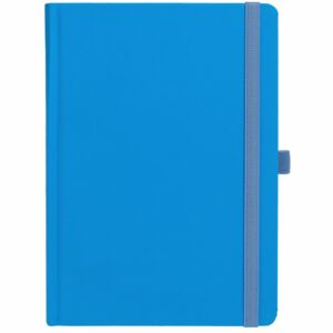 Ежедневник с твердой обложкой без поролона, выполнен из материала Soft Touch Ultra, голубой JJ, дополнен резинкой шириной 1 см, петлей-резинкой для ручки, капталом и ляссе голубого цвета.